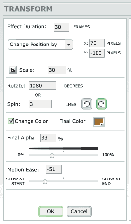 - Motion ease (Замедлить движение) — позволяет изменять скорость движения. Сделаем анимацию вначале замедленной, задав значение параметра равным -50.