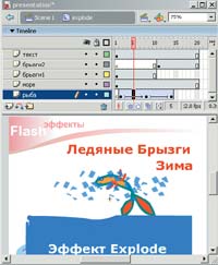 Создайте новый муви-символ «Explode», в нем на одном слое поместите изображение моря, на втором — рыбы, а на третьем — небольшого столбика воды. Слой с морем остается неподвижным, для рыбы с помощью анимации Motion Tween реализуйте прыжок из воды и в воду. С Motion Tween мы работаем давно, и я не думаю, что эта процедура вызовет у вас затруднения. Наша главная задача — создать брызги при выпрыгивании рыбы из воды и при возвращении ее в родную стихию.