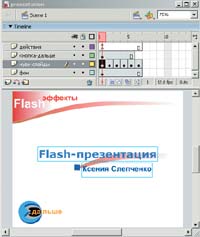 Темой презентации сделаем сам Flash, а точнее, его стандартные эффекты. Таким образом мы убьем двух зайцев одним выстрелом — научимся создавать презентацию и работать с последними достижениями Flash-разработчиков (стандартные эффекты появились только в самой свежей версии программы Macromedia Flash 2004). На этом уроке и на следующем мы более подробно познакомимся и с возможностями языка Action Script.