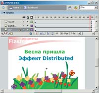 Чтобы просмотреть внесенные изменения прямо в диалоговом окне, нажмите кнопку Update Preview (Обновить просмотр). Для окончательного принятия эффекта нажмите кнопку OK. Обратите внимание на то, как должен выглядеть Timeline (Монтажный стол) после наших упражнений — он самовольно удлинился на число фреймов, заданных в поле Effect duration (Длительность эффекта) диалогового окна Distributed duplication (Распределенное дублирование), что показано на рис. 3 (см. верхнюю часть). Откройте библиотеку и перетяните на сцену несколько экземпляров автоматически появившегося символа «Distributed Duplicate 1», чтобы рассадить больше цветов (рис. 3, см. нижнюю часть). Переходим к рассмотрению следующего эффекта.