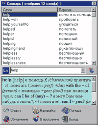 Вот уже второй год постоянно и с удовольствием пользуюсь программой-переводчиком VUDictionary. Замечательна эта утилита тем, что, во-первых, в ней два словаря, англо-русский и русско-английский, и она содержит более 126 тыс. слов и словарных статей. Как, например, у Мюллера или Ахмановой: со множеством вариантов перевода, транскрипцией и даже примерами использования выбранного слова в разговорной речи. Во-вторых, вы экономите время на поиске. Вам даже нет необходимости печатать слово целиком, поскольку список сокращается «на лету» — по ходу ввода искомого слова.