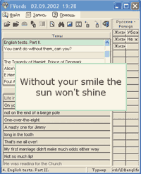 Но и это еще не все о возможностях FVords. Вот я сейчас пишу статью, а у меня на экране монитора время от времени выскакивают маленькие словарные карточки. Так программа работает в режиме «суфлер-подкидной». «Подкидываются» интересные выражения из литературы и повседневной речи. Как бы вы ни были заняты, все равно бросите взгляд на внезапно появившуюся карточку. Времени для ее прочтения — пара секунд, а польза — неоценима.