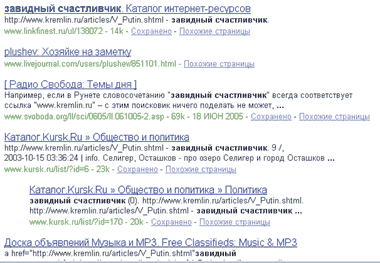 И в-третьих, поисковая формула выдачи систем Rambler.ru и Aport.ru адекватно оценила связку из сайта Kremlin.ru и наших внешних ссылок и сохранила курс на объективные критерии релевантности. Браво, «Рамблер»... Браво, Aport.ru... Но мы предпочитаем пользоваться системами Google и «Яндекс».