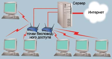 Беспроводные сети, в частности Wi-Fi (Wireless Fidelity — «точная передача данных без проводов»), имеют одно неоспоримое преимущество: не требуют никаких проводов в вашей квартире. Компьютер может спокойно переезжать с одного места на другое, что особенно ценно, если это ноутбук или «наладонник». При этом по дому также могут быть разведены магистральные кабели, но в значительно меньшем количестве. Вместо коммутаторов используются точки беспроводного доступа (рис. 3).