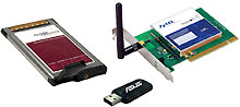 | Рис. 5. Адаптеры Wi-Fi для шин PC Card, USB и PCI |