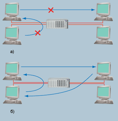 От точки присутствия провайдера по всему дому расходятся кабели. Разветвление обеспечивается с помощью концентраторов или коммутаторов. Концентраторы представляют собой простейшие повторители электрических сигналов, получающие и передающие сигналы от нескольких компьютеров, правда, при этом одновременно передавать данные может только один компьютер (рис. 1, а). Если компьютеров в такой сети много, скорость обмена между ними будет далека от идеала. Наоборот, коммутаторы разграничивают сигналы разных компьютеров, позволяя нескольким компьютерам одновременно пересылать и принимать данные (рис. 1, б). Более того, коммутаторы снимают ограничение на максимальную удаленность от точки присутствия провайдера. Сейчас недорогие концентраторы и коммутаторы практически сравнялись в цене, так что использование концентраторов можно считать признаком чрезмерной скупости, а скупой, как известно, платит дважды.