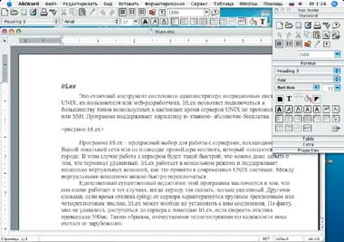Есть, к сожалению, и ложка дегтя. Версия редактора AbiWord для Mac OS X пока не так хороша, как варианты для Linux и Windows, но все недоработки носят скорее косметический характер и не отражаются на стабильности работы. Функция Full Screen, например, сводится всего лишь к исчезновению панели инструментов. А во время редактирования после замещения фрагмента текста частенько остаются лишние точки, которые немного мешают работать. Впрочем, вполне возможно, что это недостатки в реализации графической библиотеки GTK+. А последняя, как и AbiWord, все еще находится в стадии разработки.