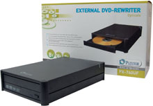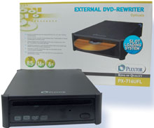Данный дисковод компании Plextor предлагается по более низкой цене, нежели PX-716UFL. Хотя внешне он и не слишком отличается от ультрамодного собрата, в нем носитель загружается с помощью лотка. Различия в скоростях работы с носителями у них невелики при записи как двухслойных, так и перезаписываемых DVD-дисков. Загрузочный лоток выполнен из черного пластика. Это, по словам производителя, снижает риск возникновения ошибок и повышает качество работы. А чтобы случайно не произошло смещение дисковода, установлены резиновые накладки. Подключаться к ПК можно с помощью интерфейсов USB 2.0 и IEEE 1394.