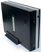 Недавно на рынке внешних записывающих дисководов стало одним игроком больше — корпорация Samsung пришла и в этот сегмент. Привлекает невысокая цена выпускаемого ею устройства. Элегантный корпус модели, выполненный из черного пластика, украшен серебристыми вставками. Дисковод оснащен разъемом USB 2.0, наиболее распространенным на ПК. Есть и выключатель питания, помогающий при зависании ОС. Отверстия на задней стороне дисковода служат для пассивного охлаждения. Отсутствие вентилятора хорошо сказывается на его акустических свойствах: как работает SE-W164, практически не слышно. Кроме того, в комплект входит удобная подставка, позволяющая установить дисковод вертикально, чтобы освободить место на столе.