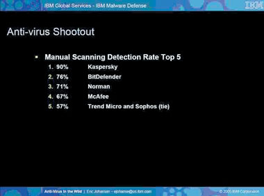 Боимся вас разочаровать, уважаемые читатели, — ситуация с оперативным обменом информацией между антивирусными компаниями противоположна представленной в статье. Сейчас в антивирусной индустрии существует практика регулярного (в основном ежемесячного) обмена вирусными коллекциями. Кроме того, при появлении новой серьезной угрозы обмен информацией осуществляется практически незамедлительно, поскольку во главу угла ставится глобальная безопасность пользователей, а не конкурентная борьба. Подтверждение тому — ежегодные конференции производителей антивирусов, проводимые Virus Bulletin, организации типа CARO и AVPD (Anti-Virus Professional Developers Assosiation) и проч. На маркетинговом уровне антивирусные компании конкурируют, а на технологическом — сотрудничают. В настоящее время скорость обмена информацией достаточно часто оказывается выше, чем темпы распространения новой вредоносной программы, и именно благодаря этому удавалось предотвращать некоторые глобальные эпидемии.