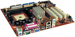 Небольшая плата формфактора microATX. Рассчитана на минимум функциональности: имеет лишь пару разъемов для памяти, два канала UDMA 100 (на четыре устройства) и два — Serial ATA. Звук предусмотрен также только шестиканальный (5.1), причем звуковая стойка на задней панели содержит всего три разъема, так что придется выбирать между полной функциональностью выхода 5.1 и наличием микрофонного и линейного входов. Впрочем, можно воспользоваться цифровым интерфейсом S/PDIF и сохранить аналоговые входы. Но для этого придется искать монтажную скобу с необходимыми гнездами, а возможно, и с некоторыми радиоэлектронными элементами — в комплект она не входит.