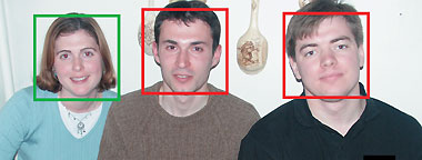 Когда я подошел ко второму стенду, то обнаружил, что мое лицо на экране также взято «на прицел», только рамка имеет красный цвет. Кандидат на уничтожение? Нет, все гораздо оптимистичнее: затвор щелкает лишь тогда, когда снимаемый улыбается. Та же технология будет применяться и для распознавания открытых глаз: прощайте, кислые мины и закрытые очи на фотографиях!