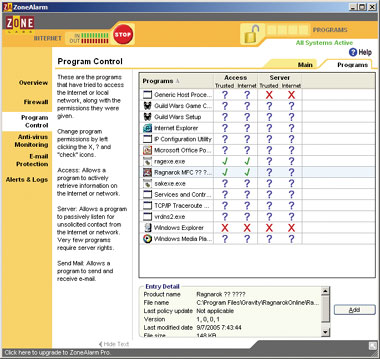 | ZoneAlarm позволяет управлять доступом в сеть для каждой программы. Приложения, которым вы доверяете, будут иметь автоматический доступ, а остальные могут быть блокированы или вынуждены запрашивать разрешение |