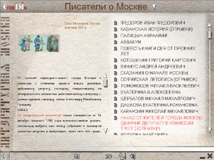По сути, диск — своеобразная энциклопедия о Москве. Вот названия только нескольких разделов: «Наша древняя столица», «Достопримечательности», «Литературная Москва»... А ведь разделы имеют еще и подразделы: «Летопись событий», «Писатели о Москве», «Площади и бульвары», «Монастыри и храмы», «Сады и парки»... А внутри подразделов есть и главы... Словом, если вы проштудируете данный диск, то вполне сможете стать весьма подготовленным гидом для своих иногородних друзей.