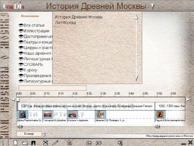 Кстати, об экскурсиях. С помощью раздела «Мои рассказы о Москве» их можно создавать самостоятельно. Выкладывайте на «монтажный столик» озвученные статьи, добавляйте к ним необходимые иллюстрации — и вот вам виртуальная прогулка по Первопрестольной. Правда, «работать» она будет лишь в присутствии «Москвоведения». Это вовсе не упрек разработчикам. Давайте не забывать, что перед нами в первую очередь школьное пособие. И не надо им пенять на то, что для переноса рассказа с одного компьютера на другой они выбрали флоппи-диски. Это мы уже давно используем дискеты как украшение для рюкзаков, а в средней российской школе до USB, похоже, дорастут не скоро.