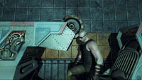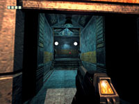 Замечу, что даже если вы убьете охранника, то лишь изредка сможете пользоваться его оружием, поскольку оно «умное» и слушается лишь хозяина, идентифицируя его по ДНК. Точнее, оружие подчиняется любому человеку, чья цепочка ДНК числится в главном компьютере тюрьмы. Естественно, получив доступ к этому устройству, можно «залить» в него свою ДНК и... Однако добраться до мейнфрейма не так легко, и потому придется и хитрить, и вступать в рукопашный бой. В большинстве случаев удается избежать открытой схватки с охранниками. Лучше подкрасться к противнику сзади и свернуть ему шею. Чтобы «осторожно подобраться», в арсенале игрока имеется стелс-режим, будучи в котором Риддик способен контролировать вероятность обнаружения охраной. Физически это выглядит так: если опасность далеко, то все объекты на экране имеют синеватый оттенок, словно они видны через синее стекло, но когда кто-то приближается, то краски начинают проявляться и вы слышите стук сердца жертвы. По мере продвижения по сюжету помимо столь замечательных рефлексов Риддик получает также возможность видеть в темноте. Кроме того, наш герой обладает способностью к регенерации. Правда, здесь есть некоторые ограничения. Уровень здоровья персонажа поделен на равные доли (в начале игры их четыре), и лишь частично поврежденная часть регенерирует, т.е. если вы потеряли 1,5 единицы здоровья, то восстановится 0,5, а остальное можно будет поправить посредством специальной медицинской станции NanoMed.