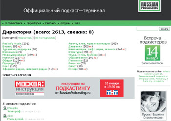 Подкастинг дошел до России, темпы роста его стремительны, потенциал огромен. Первый отечественный подкаст-терминал открылся в 2005 г., но уже сейчас список подкастов на нем невозможно просмотреть за одну прокрутку колесика мыши. Кто делает и развивает его в нашей стране? Первопроходцами считаются Василий Стрельников, в прошлом известный ведущий, а в данный момент руководитель проекта Russianpodcasting.ru, и Олег (Оклин) Чистов, главный веб-мастер первого российского подкаст-терминала. Они утверждают, что все это начиналось как шутка. Василий, разочаровавшись в радио и телевидении, решил «уйти на пенсию». Пока отдыхал, открыл для себя подкастинг. И придумал на strelnikov.ru выложить MP3-файл с темой «Чем занимается стареющий мега-ведущий на пенсии». Эта инициатива привлекла огромное количество народа. Так и родился сайт Russianpodcasting.ru. Теперь страница сама развивается, растет, как живой организм, идет вверх по посещаемости и количеству загрузок. Периодически Оклин делает какие-то технические вливания: «Стараемся, чтобы всем было удобно. Сейчас уже записи превысили 5 Гбайт, это более 1000 подкастов объемом более 5 Мбайт. В день скачивается более полутора тысяч подкастов. Обновляем дизайн, включили категоризацию. Постоянно расширяем технические возможности серверов, место увеличиваем. Сейчас уже существует очень много категорий и разделов. Кино, музыка, политика... Есть очень интересные подкасты на темы веб-дизайна». Самый популярный из компьютерных — Russian Apple podcast, где рассказывается об интересных новинках, современных технологиях.