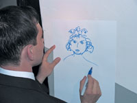 Процесс выкупа обычно заключается в выполнении женихом ряда заданий. Например, найти отпечаток губ невесты на бумаге (рис. 2). Также от него могут потребовать нарисовать портрет невесты (рис. 3). Как правило, все это происходит либо в подъезде на лестнице (если невеста живет в многоквартирном доме), либо непосредственно на подходах к дому. Ваша задача — запечатлеть процесс. Если вы идете на свадьбу в первый раз, а на нее приглашен также оператор, то старайтесь не отставать и быть всегда рядом с ним. Это позволит правильно найти позиции, поскольку в целом выбор наиболее удачного ракурса для видео- и фотосъемки совпадает. При выкупе сразу займите передовые позиции (т.е. впереди всех) и придерживайтесь их по мере продвижения, что позволит вам не пропустить самые интересные моменты, а если сие действие происходит на лестнице, то вы сможете снимать сверху, что расширит поле для сюжетных маневров. Снимайте все, что покажется вам интересным: выражения лиц жениха и гостей, конкурсы. Не забудьте захватить запасной комплект аккумуляторов, поскольку при интенсивной съемке одного комплекта может не хватить.