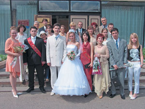 Этап загса — самый торжественный и важный. Невеста и жених подъезжают к Дворцу бракосочетания на разных машинах. Процедура официальной регистрации в загсе назначается заранее и в строго определенное время. Обычно гости и молодожены прибывают к загсу загодя, так что у вас есть возможность поснимать их (рис. 6). В загсе праздничная обстановка, и пользуясь этим, поищите наиболее удачные ракурсы для фотосъемки. Профессионалы для этого специально перед свадьбой приходят в загс и тщательно его обследуют, присматривая наиболее удачные места для фотосъемки. При возможности сделайте групповую фотографию всех присутствующих. Здесь главное, чтобы всех было видно. Жениха и невесту в центр, свидетелей рядом с ними. Разместить гостей обычно лучше всего удается на лестничной площадке. Сразу после съемки проверьте, не получился ли кто-нибудь с закрытыми глазами, — иначе это придется потом исправлять в графическом редакторе. На групповой фотографии, показанной на рис. 7, есть минимум три погрешности — попробуйте их отыскать.