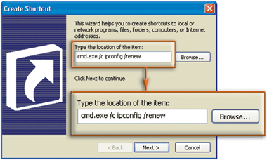 Команды cmd.exe (Windows 2000 и XP) и command.com (Windows 98 и Me; точку и расширение в имени команды можно опускать), открывают окно, в которое вводятся другие обсуждаемые здесь команды. Используя любую из этих двух команд с переключателем /c, можно создать ярлык, позволяющий открыть командное окно, выполнить ту или иную команду и потом закрыть выбранное окно. Это позволит запускать команду, просто щелкнув на соответствующем значке или выбрав ее из меню «Пуск». Например, для создания значка для обновления сетевого подключения щелкните правой кнопкой мыши на Рабочем столе либо на любой папке и укажите «Создать•Ярлык». В раскрывшееся окно введите последовательность cmd/c ipconfig /renew (рис. 2; рассказ о команде ipconfig ниже). Щелкните на кнопке «Далее» и следуйте инструкциям программы-мастера создания ярлыка. Если вы хотите оставить открытым командное окно, чтобы видеть результаты выполнения команды, замените переключатель /c на /k. Аналогичная техника использования ярлыка подойдет для многих из перечисленных ниже команд.