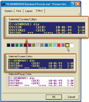Придаем командному окну новый вид. Чтобы сделать командное окно симпатичнее, щелкните правой кнопкой мыши на его заголовке и отметьте пункт «Свойства». На закладке «Шрифт» выберите гарнитуру и размер шрифта; при этом изменится и размер окна. В Windows 2000 и XP разрешается изменять также цвет фона и шрифта, для чего следует перейти на закладку «Цвет» (рис. 1), и кроме того, устанавливать размер окна по умолчанию на закладке «Расположение». Когда вы щелкнете на OK, Windows предложит на выбор либо изменить свойства только текущего окна, либо применять изменения и ко всем будущим командным окнам.
