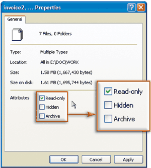 | Рис. 3. Команда attrib позволяет изменять атрибуты нескольких файлов за один прием |