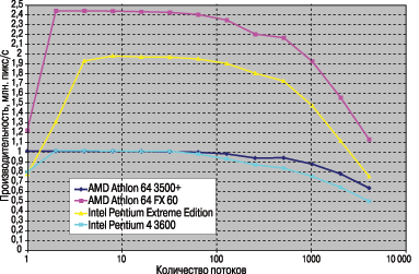 С выходом Athlon 64 FX 60 сегмент высокопроизводительных вычислений полностью перешел во власть двухъядерных (и с большим числом ядер) решений, но существующее ПО пока не очень вразумительно оценивает свойства многоядерных процессоров. Чтобы ликвидировать этот пробел, была написана программа для решения задачи, допускающей эффективное распараллеливание, — построения фрактала Жюлиа (подробнее об этом см. «Мир ПК-диск», №11/05). На графике («Производительность в многопоточном режиме») показана зависимость производительности процессора от числа формируемых потоков при изменении количества последних от 1 до 4096 с шагом в 2 раза. Для типичного одноядерного процессора (например, Athlon 64 3500+) зависимость имеет вид горизонтальной кривой (т.е. неизменной производительности) при количестве потоков примерно до сотни, затем производительность постепенно снижается за счет накладных расходов на создание и уничтожение потоков и переключения между ними. Производительность типичного двухъядерного процессора (например, Athlon 64 FX 60) скачком увеличивается вдвое при переходе с одного на два потока и в дальнейшем ведет себя аналогично предыдущему варианту. В случае с применением технологии HyperThreading производительность также претерпевает скачок, но за счет того, что логические ядра не являются полноценными процессорами, величина скачка составляет только 25%. Впрочем, и 25% — не так уж мало. Такого прироста можно было бы ожидать лишь от увеличения тактовой частоты до 4,5 ГГц, что пока находится за пределами возможностей современных технологий. Хотя в данном случае это всего лишь позволяет 3600-МГц процессору Pentium 4 догнать конкурента от AMD, работающего на тактовой частоте 2200 МГц и имеющего рейтинг 3500+. Двухъядерный же процессор, оснащенный технологией HyperThreading, демонстрирует увеличение производительности в 2,5 раза начиная с четырех— восьми потоков. Правда, это все равно не позволяет ему догнать флагмана компании AMD.