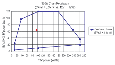 | Кросс-нагрузочная характеристика БП мощностью 300 Вт, рекомендуемая спецификацией ATX, и максимальная зафиксированная реально потребляемая мощность (отмечена красной точкой) |