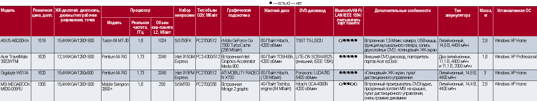 Основные характеристики протестированных ноутбуков