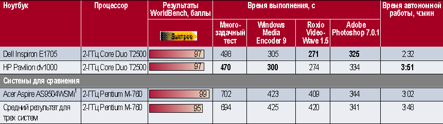 Примечания: ноутбуки Dell и Acer оснащались Windows XP Media Center Edition, а остальные — Windows XP Proffessional. Для теста PCWorldBench и времени автономной работы наибольший результат — лучший. Для времени выполнения заданий — наоборот. Лучшие результаты выделены жирным шрифтом.