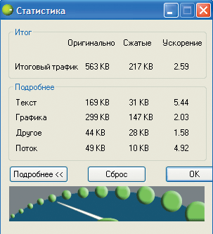 Эффективность работы сервиса можно наглядно оценить, вызвав окно статистики. Тест на время загрузки браузером текстовой веб-страницы с использованием GPRS-соединения и сервиса OnSpeed показал скорость 245 кбит/с. Другие сервисы по сжатию данных демонстрируют похожие результаты, и это действительно вполне сравнимо с минимальной скоростью доступа по выделенной линии.
