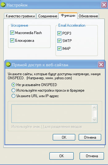 Еще одно различие в пользу OnSpeed. Программа взаимодействует с операционной системой на более низком уровне и «перехватывает» поток данных от самых разнообразных приложений (браузеры, электронная почта, мгновенные сообщения и т.д.) без необходимости каких-либо дополнительных усилий по настройке. Впрочем, из этого удобного в большинстве случаев свойства, пожалуй, все же стоит сделать некоторые исключения. Так, например, не хотелось бы использовать программу для доступа к корпоративному почтовому ящику и ряду других сервисов, чтобы не оставлять личных паролей на промежуточных серверах-посредниках. Может быть, это и излишняя предосторожность, но тем не менее. Впрочем, этот вопрос легко решается либо составлением списка серверов, доступ к которым осуществляется напрямую, либо временным отключением OnSpeed (такая опция также присутствует).