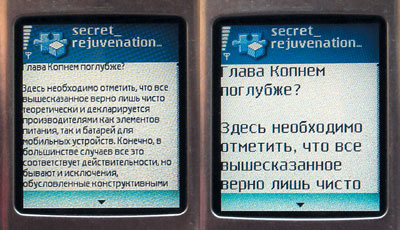 Среди минусов «мобильного» чтения — небольшой размер экрана телефона и маленькая скорость процесса (даже если выбрать шрифт помельче, на прокрутку — пусть и в режиме слайд-шоу — тратится немало времени). Без подсветки текст в большинстве случаев нечитабелен, а в режиме постоянной подсветки быстро садятся аккумуляторы. Но среди плюсов помимо невысокой цены есть один очень значительный: теперь, чтобы не расставаться в дороге с интересной книжкой, начатой вчера вечером в бумажном варианте и оставленной дома из-за веса или объема, не понадобится ни КПК стоимостью несколько сотен долларов, ни MP3-плеер с аудиовариантом — достаточно одного родного мобильного, который, как праздник, всегда с тобой. Еще одно важное достоинство этой технологии — нужная информация становится еще доступнее: зная WAP-адрес источника, можно скачать интересующий вас текст в любой момент из любой точки, не завися от стационарного ПК, ноутбука и КПК, а главное, не перебирая с десяток страниц, чтобы попасть на нужную.