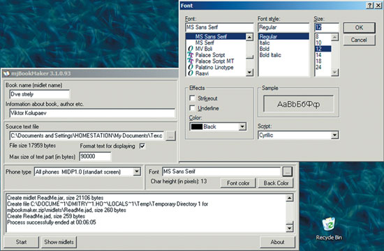 Если вы обладаете хотя бы начальными навыками общения с различными программами, то попробуйте самостоятельно воспользоваться одним из приложений, которые применяют и компании, предлагающие к продаже Java-книги, например BookMaker. С их помощью обычный текстовый формат перекодируется в книгу для вашего телефона буквально нажатием одной кнопки и за считанные секунды (рис. 1). Вы просто указываете исходный файл формата .txt, задаете название, автора (среди установок также присутствуют шрифт, его цвет и размер, фон и др.), тип телефона (предлагается выбрать из MIDP1.0 MIDP2.0 и Nokia phones), нажимаете Start — и готово. Что делать с полученным файлом, вы уже знаете. «Самодельные» Java-книги читались на тестовых телефонах без проблем.