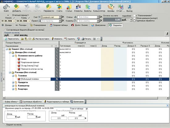 Во всех трех программах управление бюджетом строится на основе статей (счетов). Счета могут быть доходными (зарплата) или расходными (сахар, соль, спички, ежемесячный платеж за Интернет и пр.).
