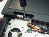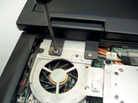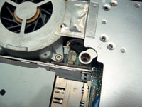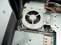 | Отворачиваем винт на левой петле... | ...и четыре винта крепления вентилятора |
