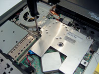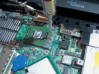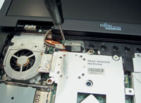 | ...и снимаем процессор | Устанавливаем новый процессор, покрываем поверхность кристалла термоинтерфейсом и собираем ноутбук в обратной последовательности |