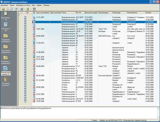 Еще один востребованный блок — «АРМ пользователя», ведь именно на своем рабочем месте сотрудник регистрирует документы, формирует поручения по ним и видит те, что предназначены ему самому, находит необходимые документы. Это АРМ имеет интерфейс, подобный хорошо известному Оutlook. Идеология его построения такова: на экране отображаются три окна, расположение которых пользователь может изменять. Одно окно — «входное», в нем находятся папки «Входящие» и «Исходящие»: по внутреннему документообороту, по внутренней почте и по поиску. Во втором отображаются элементы открытой папки, находящейся в работе. И наконец, в третьем содержится информация о выбранном элементе: для документа — ход исполнения, для текстового файла — содержимое, т.е. это аналог предварительного просмотра в MS Word.