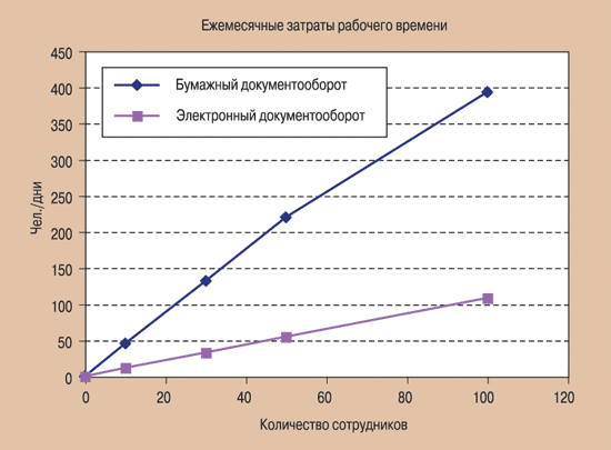| Рис. 1. Сравнение затрат времени при бумажном и электронном документообороте |