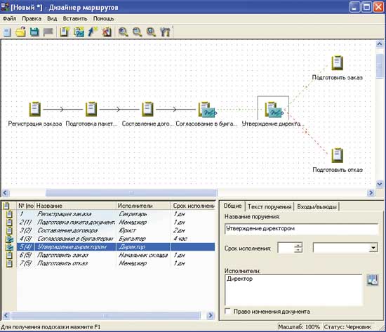 Важным инструментом настройки документооборота с учетом специфики организации является графический дизайнер маршрутов. Это средство разработки типовых маршрутов прохождения документов при выполнении однотипных операций и процедур согласования позволяет учесть многовариантность исполнения бизнес-процессов в организации. Причем данная функция довольно проста, и пользователь вполне способен сам реализовать ее. В системе есть элементы работы с документами двух типов: поручение и согласование.