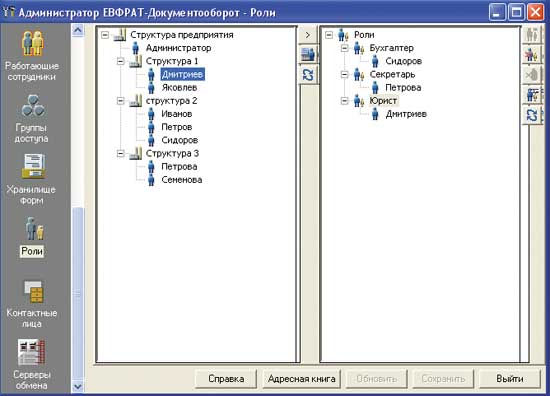 Остановимся более подробно на механизме ролей, так как опыт внедрения системы показывает, что эта функция используется довольно часто. Действительно, ведь в любой организации сотрудники периодически уходят в отпуск, а бывает, и увольняются. Или изменяется их статус, а в связи с этим и служебные обязанности. Учесть такие изменения и быстро подстроить систему как раз и помогает механизм ролей «Евфрат-Документооборота». Он позволяет очертить круг обязанностей и полномочий, связанных с реализацией специфических функций, порученных исполнителю данной роли. Фактически роль выступает здесь в качестве иного именования сотрудника. Она может использоваться везде, где указывается его имя: в списке исполнителей и контролеров поручений, в качестве получателя сообщений, при назначении прав на отдельные документы и потоки документов и т.д.