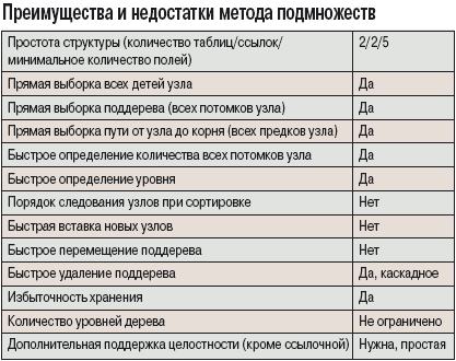 Сразу оговорюсь: к способу, продвигаемому Джо Селко (Joe Celko) и по недоразумению называемому nested sets (вложенные множества), эта схема никакого отношения не имеет. Поэтому, чтобы избежать путаницы, я даже изменил информативное название «вложенные множества» на более простое.