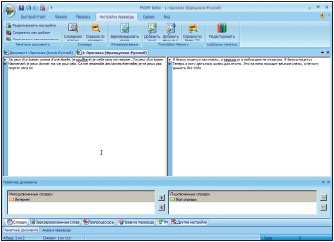 Изменившийся внешний вид программы, естественно, обращает на себя внимание при первом же запуске. В PROMT 8.0 используется модель интерфейса в стиле Microsoft Office 2007: вместо меню — «лента» с кнопками, нажатие на которые выводит на панель список доступных для каждой задачи действий. Подобная концепция весьма удачна: при сравнительно небольшом количестве пунктов в каждой «подкнопке» интерфейс получился очень наглядным и после незначительного периода адаптации скорость работы неминуемо должна вырасти. Надо сказать, что системе перевода обновка идет гораздо больше, нежели самим программам из состава Office. Вполне возможно, впрочем, что дело здесь сугубо в привычках и степени личного автоматизма при работе с одной из программ.