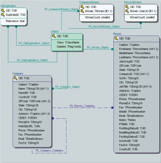 Служебные таблицы CompanyNGrams и PersonNGrams хранят соответственно подстроки-грамы объектов классов «Компания» и «Контактное лицо». Таблица ObjDuplicates благодаря унифицированной связи по OID хранит связи между потенциальными дубликатами обоих классов.