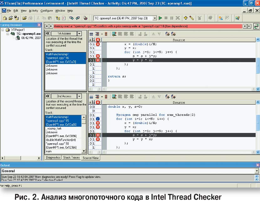 После установки Intel Thread Checker в диалоге New Project приложения Intel VTune Performance Analyzer появится новая категория проектов — Threading Wizards (мастера для работы с потоками), среди которых будет Intel Thread Checker Wizard. Необходимо выбрать его, а в следующем окне мастера указать путь к запускаемой программе. После запуска программа начнет выполняться, а профилировщик соберет все сведения о работе приложения. Пример такой информации, выдаваемой Intel Thread Checker, приведен на рис. 1.
