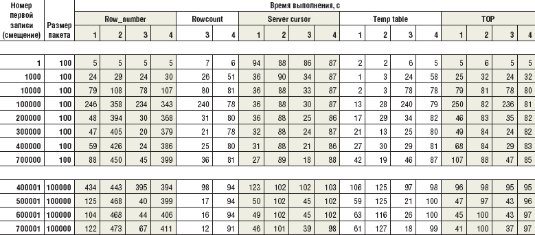 Не забудьте увеличить размер системной базы tempdb. Для данного примера она составила 1,5 Гбайт. В отсутствии верхнего предела для временных данных и заключается основной недостаток метода: чем больше исходная таблица и чем дальше от начального значения находится очередной запрашиваемый нами пакет, тем больше потребуется заливать данных во временную таблицу. Конечно, дисковое пространство нынче большое и дешевое, но все-таки винчестер не резиновый, а скорость с ростом числа загружаемых во временную таблицу строк будет падать.