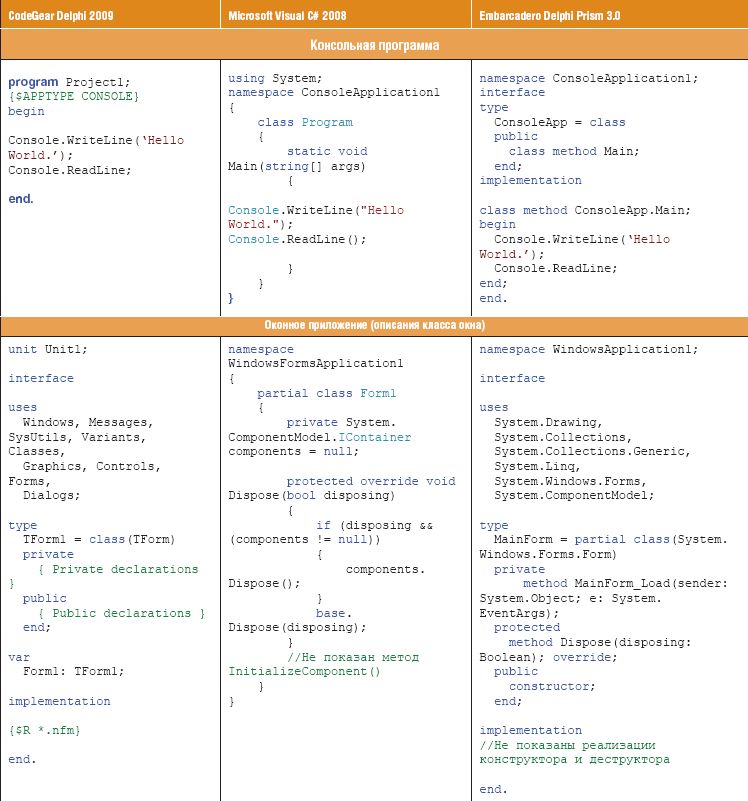 Если со средой (т.е. с внешними атрибутами производственного процесса написания кода) все понятно, то с самим языком надо будет еще разбираться и, видимо, долго привыкать к нему. Delphi Prism скорее напоминает Delphi for WinForms, чем Delphi VCL, ведь концепция полной интеграции с технологиями Microsoft предполагала расставание с такой родной и ясной иерархией VCL. Но это не значит, что для VCL настал конец. В пакете Delphi остались все обычные средства для сборки платформенных программ. Просто сейчас разработчик, использующий синтаксис Delphi, может иметь реальный выбор средств с учетом нескольких перспектив: программы, среды разработки, платформы разработки и разработчика.