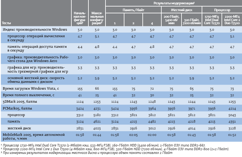 Протестировав данный ПК, мы пришли к неутешительным выводам. Конечно, для работы с офисными приложениями "оно"(?) еще более-менее пригодно, но вот для чего-то более серьезного -- вряд ли. Собственно, все это видно из таблицы: время полной загрузки Windows Vista, составляющее 155 с, -- далеко не лучший показатель. А вот результаты встроенного индекса производительности удивили: вообще-то такие цифры характерны хотя и не для самого мощного, но для вполне нормального компьютера. Впрочем, попытка запуска ресурсоемких приложений расставила все по своим местам: индекс производительности Windows -- вещь в себе, поэтому показания его, мягко говоря, излишне оптимистичны. Но довольно хаять несчастный ноутбук -- не для того мы его брали (по крайней мере, на этот раз). Лечить так лечить -- поглядим, до чего тут проще всего добраться.