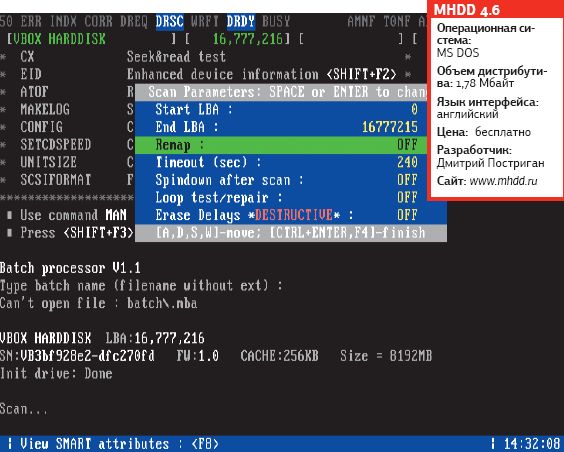 Если вы решите поближе познакомиться с этой крохотной утилитой, обратите внимание на самый главный атрибут для современного накопителя — Reallocated Sectors Count (значение Raw). Оно сообщает количество переназначенных секторов. Нормальный диск имеет нулевое raw-значение. Если вы видите число более 50, значит, у накопителя (впрочем, и у вас также) появились проблемы. Это может означать сбои в блоке питания, воздействие вибрации, перегрев или заводской брак. Взгляните на атрибут 194, показывающий температуру диска. «Приличные» значения лежат в промежутке между 20 и 40 °С (к слову сказать, некоторые диски не «отчитываются» о своей температуре). Атрибут UDMA CRC error rate означает количество ошибок, возникающих при передаче данных по кабелю IDE/SATA: нормальное raw-значение этого атрибута — нулевое. Если вы видите другое, вам нужно срочно заменить кабель. И безусловно, оверклокинг весьма ощутимо сказывается на количестве ошибок такого типа. Сюрприз: MHDD умеет осуществлять ремап (сокрытие) сбойных секторов жесткого диска.