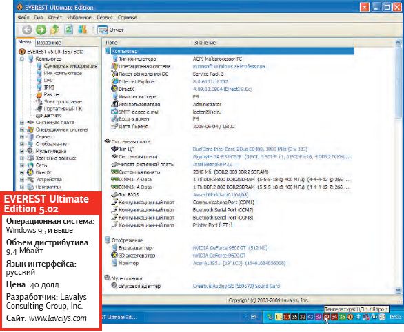 На наш взгляд, это приложение должно быть у каждого специалиста, занимающегося ремонтом и обслуживанием компьютеров. Главные миссии данного продукта — сбор информации о системно-аппаратной начинке машины и создание отчета в удобоваримом формате. Свежие сборки программы выходят с завидным постоянством, впрочем, иначе и быть не может: новые устройства предлагаются ежемесячно. Так, текущая сборка (дата выхода — 25 мая сего года) в числе прочего научилась отображать информацию о видеоплатах nVidia, работающих в режиме SLI в среде Windows Vista и Windows 7. Наряду с инсталляционным файлом предлагается и ZIP-архив с программными файлами, что позволит запускать EVEREST с любого носителя.